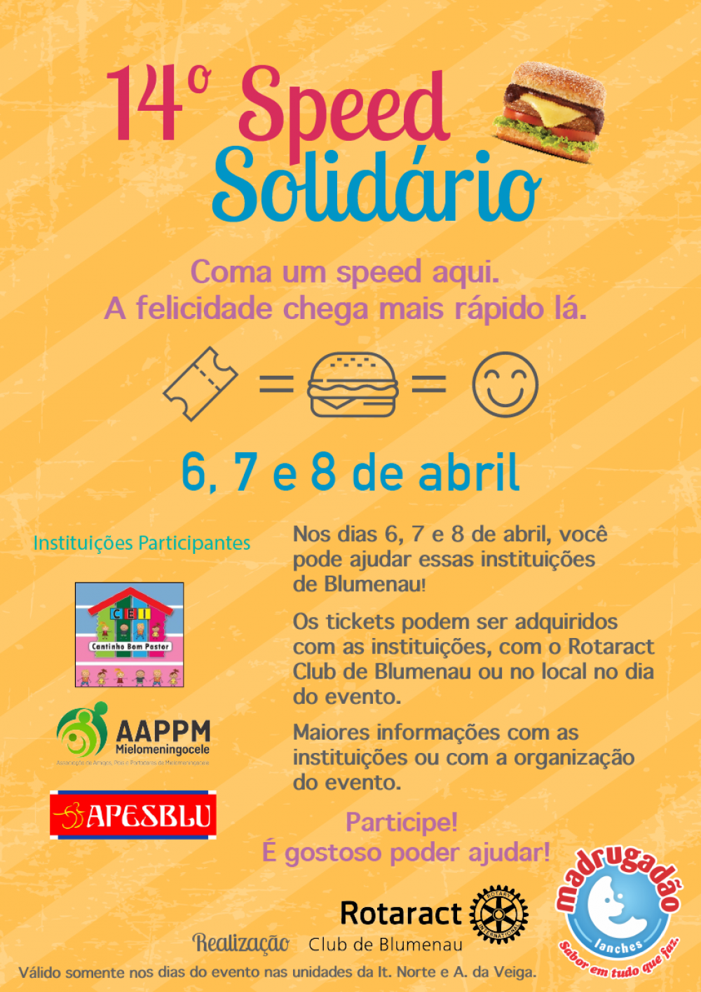 Adquira seu Speed Solidário por apenas R$ 8,00, e colabore com a AAPPM - Mielomeningocele. O evento é uma parceria do Rotaract, Madrugadão e as instituições sem fins lucrativos de Blumenau.